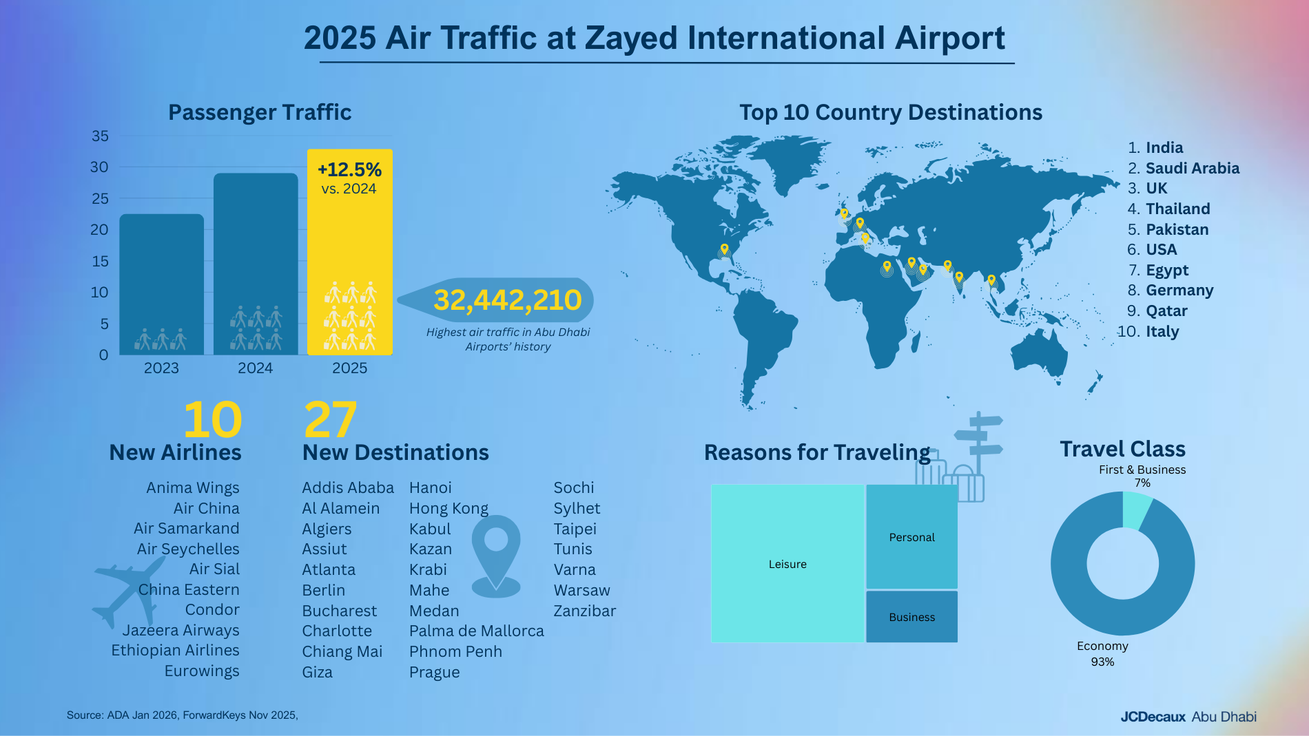 Airports are dynamic environments where passengers are highly engaged, receptive, and ready to discover. In 2025, a total of 32.5 Million travelers passed through Zayed International, representing a diverse and valuable audience for brands looking to make an impact. From business executives to leisure travelers, passengers are selected audiences on the move that provide brands with strategic opportunities to connect with the right consumers at the right moment.
