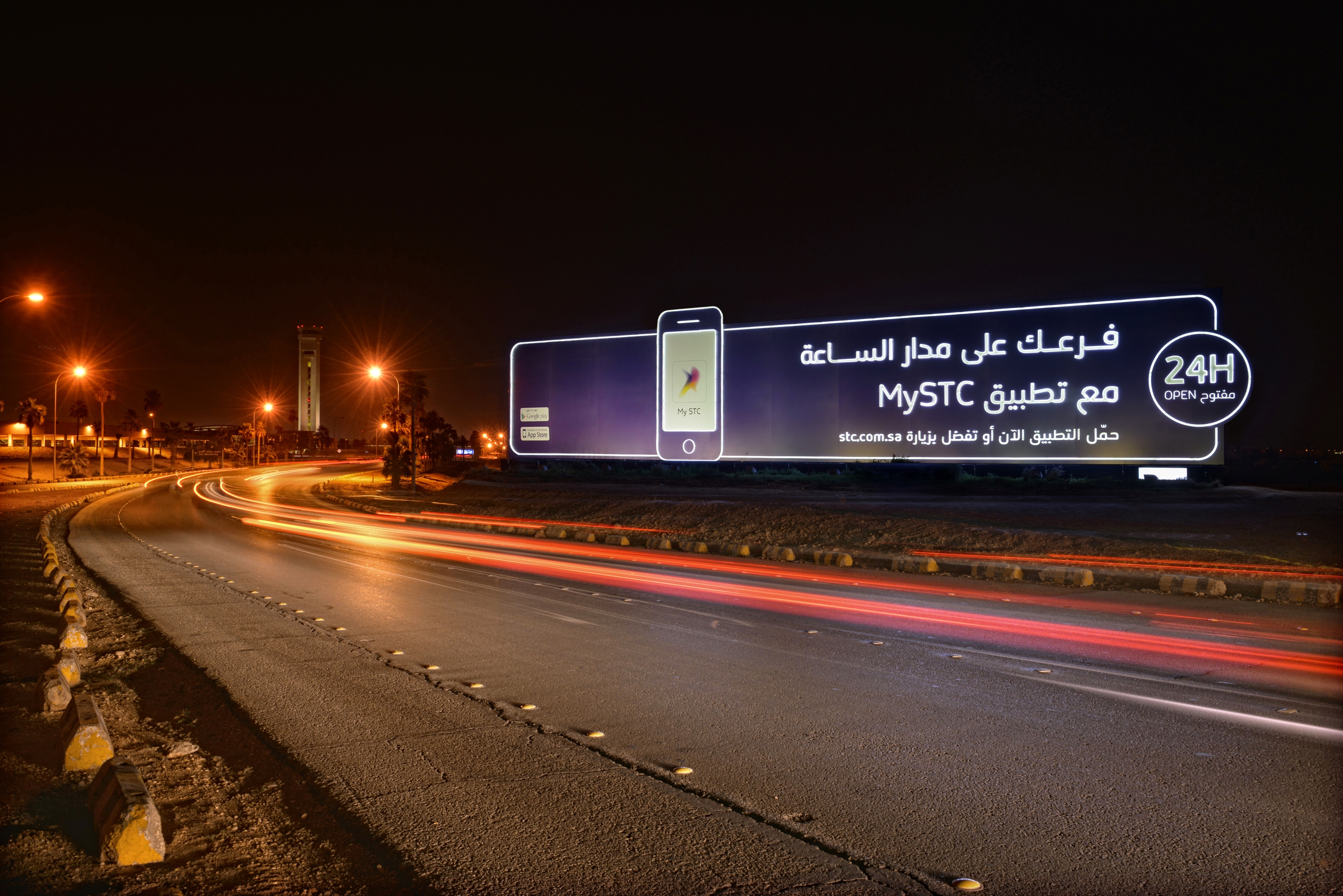 Insallation of neon lights + die-cuts to advertise STC's new phone application on the scaffold at Riyadh airport. At night, the text lights up providing high visibility.